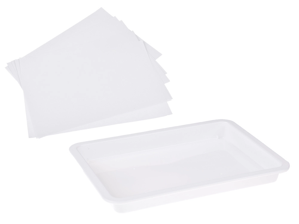 Bakje, papier, verf, pipetten, kam, penseel en spatel – kortom alles wat je nodig hebt voor je eerste gemarmerde kunstwerk.