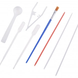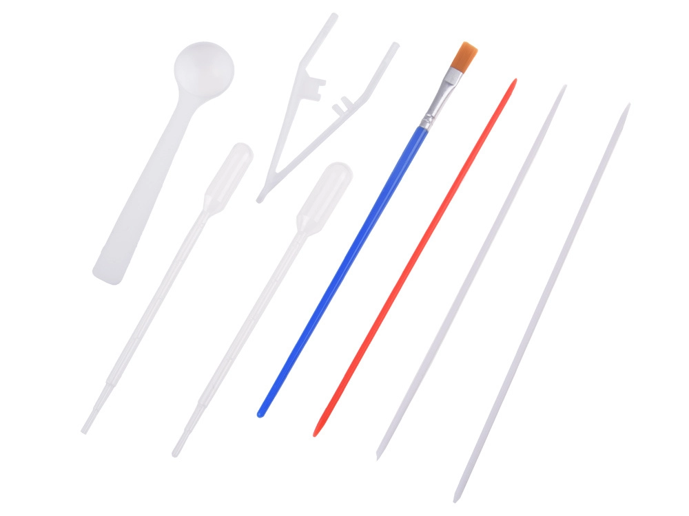 2 pipetten/druppelaars, lepeltje, pincet, kam, penseel, spatel, naalden om te tekenen
