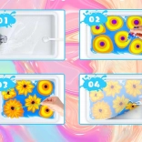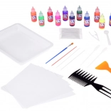 In de doos vind je alles wat je nodig hebt: 12 flesjes verf (16 ml) met een precieze spuitmond, een kunststof bakje, papier en een set gereedschappen (pipetten, kam, penseel, spatel e.a.). Na het mengen van het poeder met water maak je een gelbad waarin je de kleuren druppelt en het patroon modelleert – dat druk je vervolgens eenvoudig op papier af.