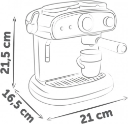 De praktische set bevat 2 bekers, 2 lepeltjes en 2 koffiecapsules, zodat kinderen ook vriendjes of broertjes en zusjes kunnen bedienen. De compacte afmetingen van 16,5 × 21 × 21,5 cm garanderen dat de machine op elk kinderkeukentje past.