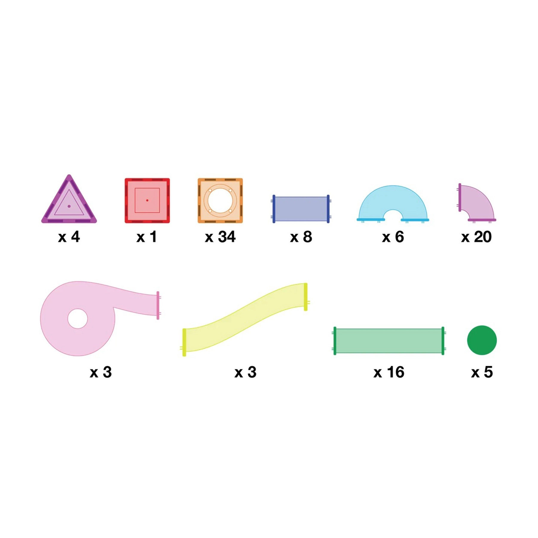 - 100 onderdelen: magnetische tegels, hellingen en buizen
