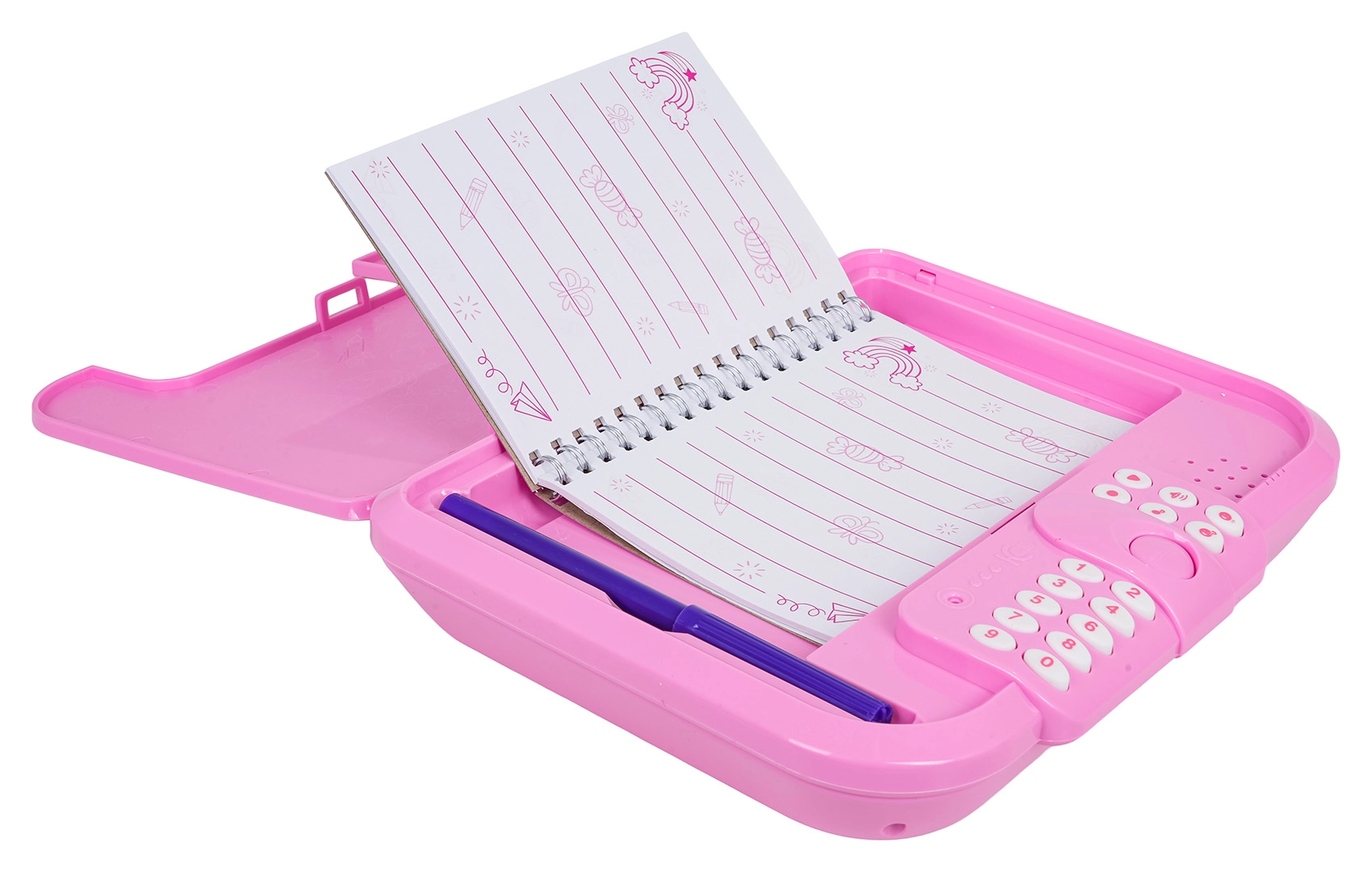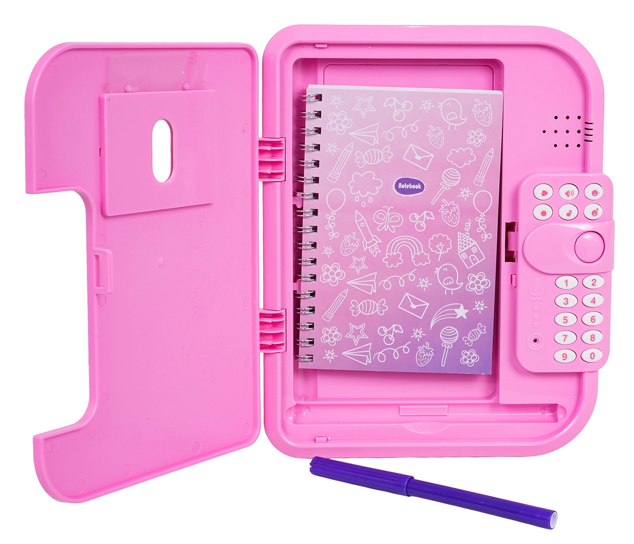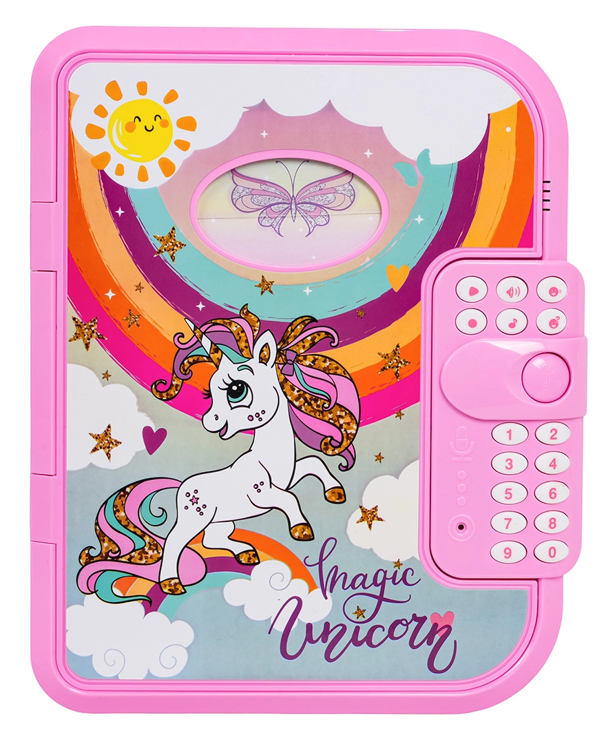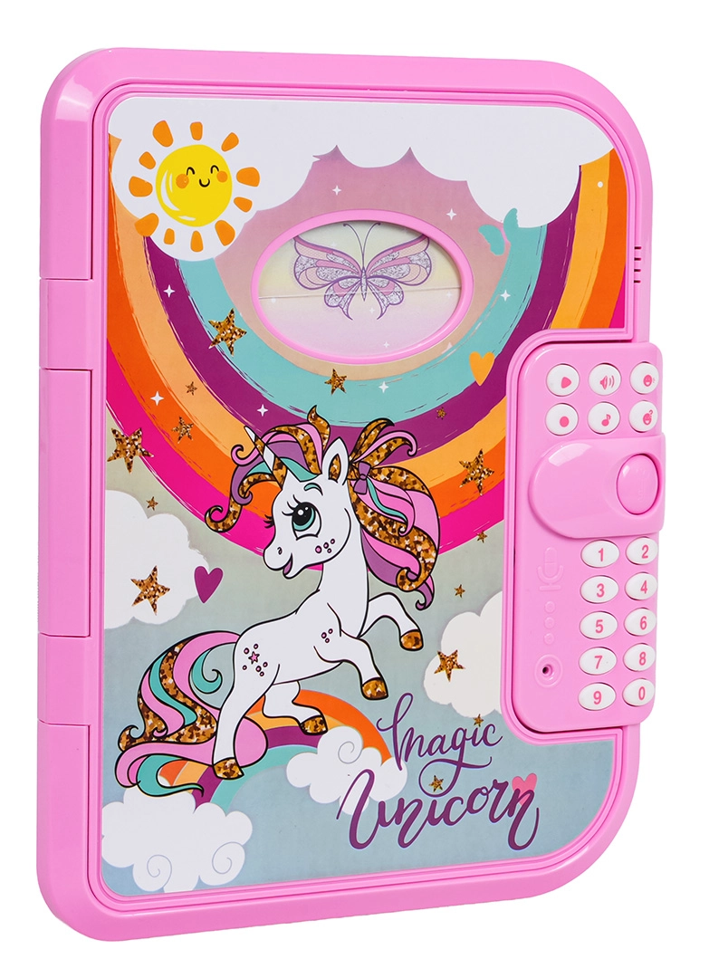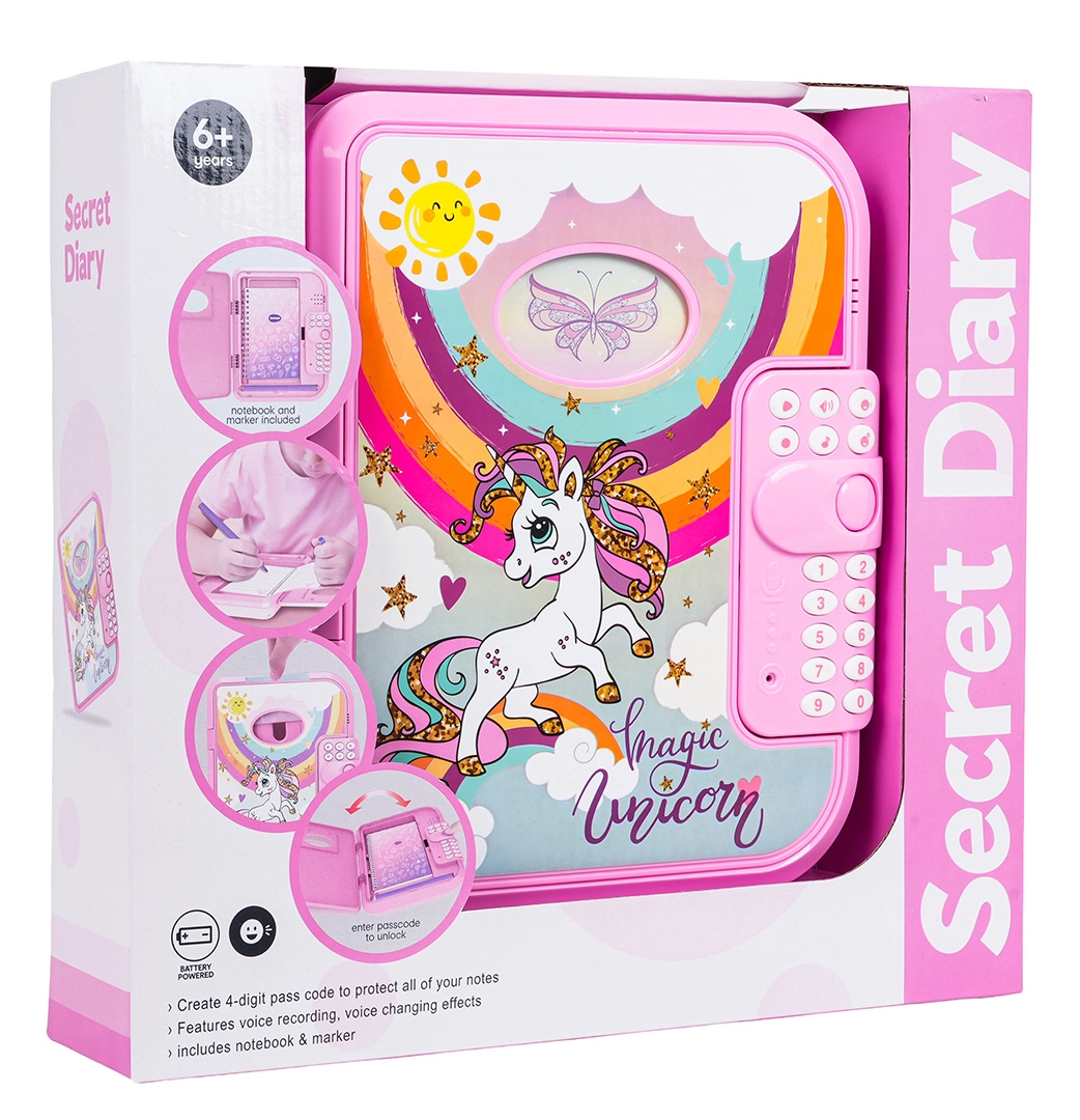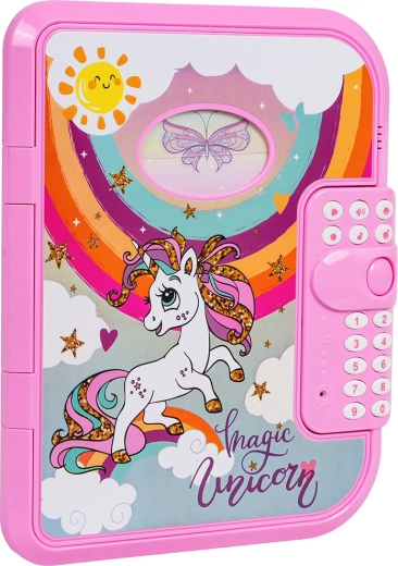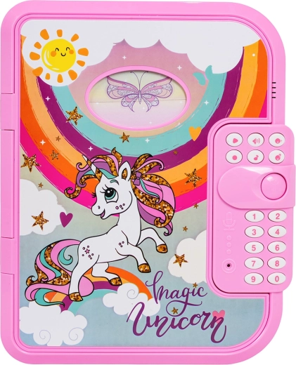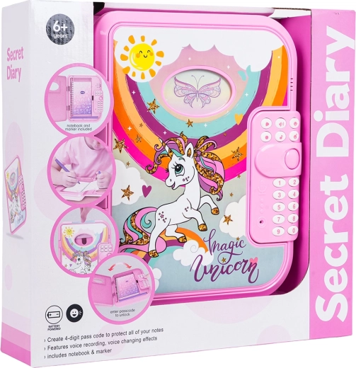 Dit elektronische geheime dagboek met eenhoorn beschermt de privacy van kinderen met een PIN-slot. Kinderen kunnen tot 10 eigen berichten opnemen, vrolijke melodieën afspelen, de stemkleur aanpassen en genieten van het interactieve spel “Raad mijn code”. In het deksel zit een transparant venster voor een foto van de eigenaar en binnenin een praktisch notitieboekje met stift.