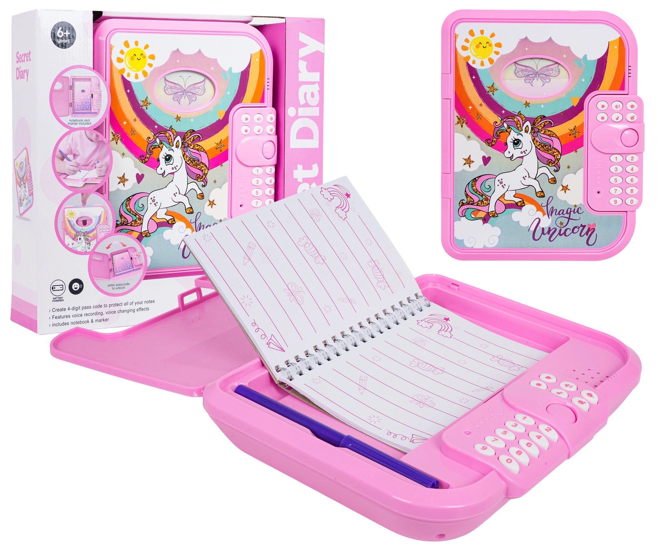 Bescherm kindergeheimen met dit betoverende dagboek met eenhoornthema. Het biedt een PIN-slot, spraakopname met tot 10 opnames, stemverandering, 10 melodieën, het leuke spel “Raad mijn code”, volumeregeling en een geheime opbergruimte. Binnenin zit een notitieboekje en stift, in het deksel plek voor een foto. Ideaal als cadeau voor kinderen vanaf 6 jaar.