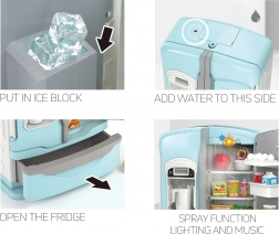 Deze kinderkoelkast is een geweldige aanvulling op elke kinderkookhoek. Na het gieten van water in de opening bovenaan en het openen van het deurtje ontstaat een aantrekkelijk neveleffect, dat samen met het LED-licht en de geluidseffecten de fantasie en het speelplezier bij rollenspellen stimuleert.