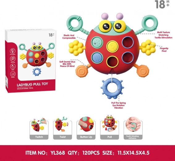 Dit schattige multifunctionele lieveheersbeestje is een sensorisch speeltje voor kinderen vanaf 18 maanden. Het combineert levendige kleuren, verschillende texturen om op te bijten en bewegende elementen om aan te trekken, te schuiven en te draaien, die de fijne motoriek en cognitieve vaardigheden ondersteunen. Na het uittrekken van het koord rammelt het lieveheersbeestje en beweegt het met de oogjes – ideaal voor in de kinderwagen, het bedje en de auto.