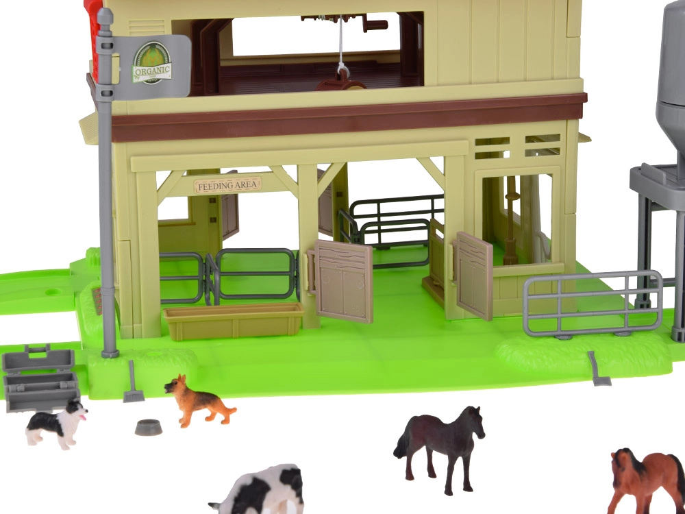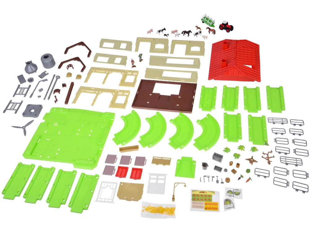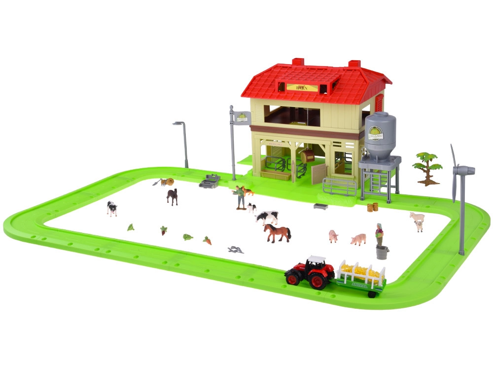 Deze complete set tovert de kinderkamer om tot een klein platteland. Kinderen kunnen dieren voeren, hooi vervoeren met de tractor met aanhanger, het schuurdak openen voor gemakkelijke toegang en de silo gebruiken om voer in en uit te laten stromen. De groene baan/circuit verbindt alle onderdelen van de boerderij tot één speelse scène.