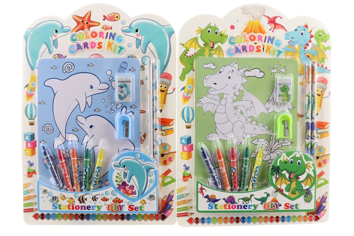 In de verpakking vind je kleurpotloden, een gum, een puntenslijper, 2 gewone potloden en kleurplaten – alles klaar voor direct gebruik. De set is verkrijgbaar in 2 soorten, die wij leveren afhankelijk van de actuele voorraad.