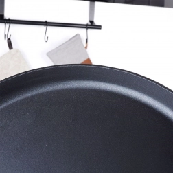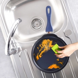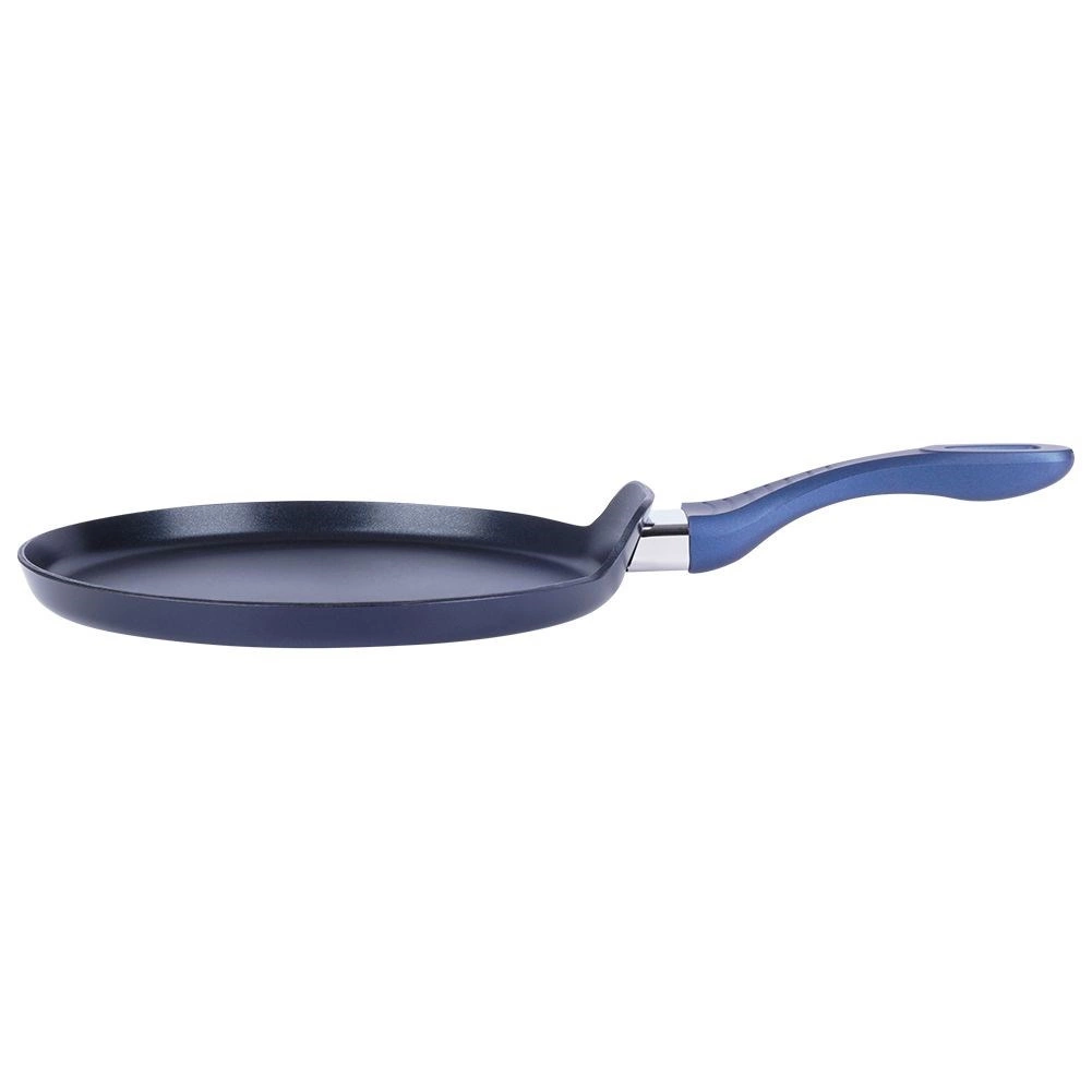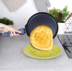 De handgreep met zachte siliconen blijft koel en ligt comfortabel in de hand. De lage rand vergemakkelijkt het gieten van beslag, optillen en omdraaien van pannenkoeken. De pan is vrij van PFOA en PTFE, bestand tegen reinigingsmiddelen en dankzij de inductiebodem compatibel met alle soorten kookplaten.