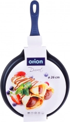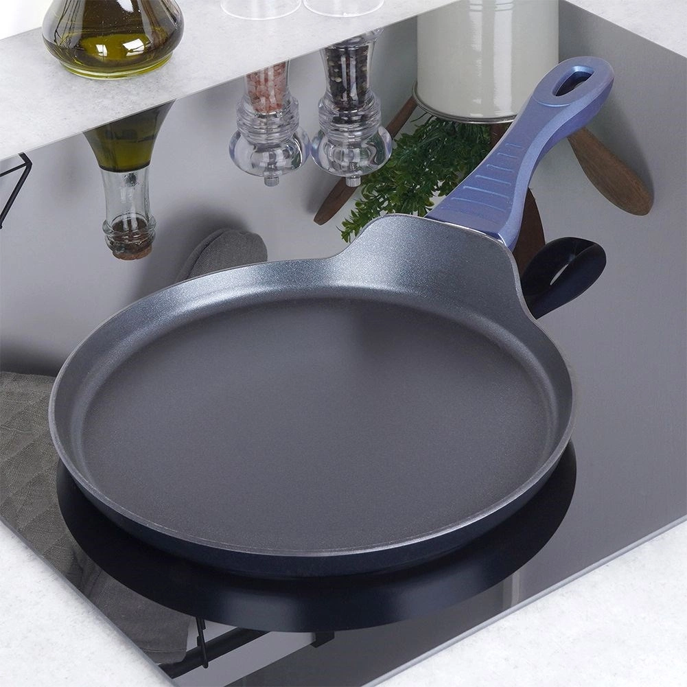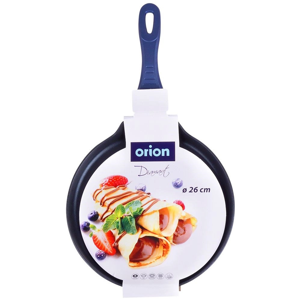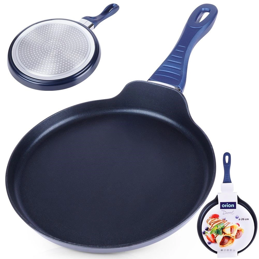 Ontdek de pannenkoekenpan met een diamanten antiaanbaklaag met een diameter van 26 cm, gemaakt van duurzaam gegoten aluminium. Biedt snelle en gelijkmatige warmteverdeling, is vrij van PFOA en PTFE en dankzij de ergonomische handgreep met antislip siliconen ligt hij comfortabel in de hand. Geschikt voor alle soorten kookplaten, inclusief inductie, en vaatwasmachinebestendig.