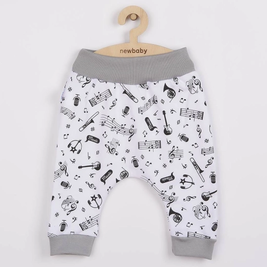 Comfortabele baby half-slaapbroek van zachte 100% katoen NEW BABY Music, met een originele print van noten en muziekinstrumenten. Heeft een brede, niet-knellende boord in de taille en drukknopen tussen de beentjes voor gemakkelijk verschonen. Het universele design is geschikt voor meisjes en jongens en ideaal voor dagelijks gebruik.