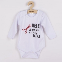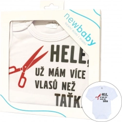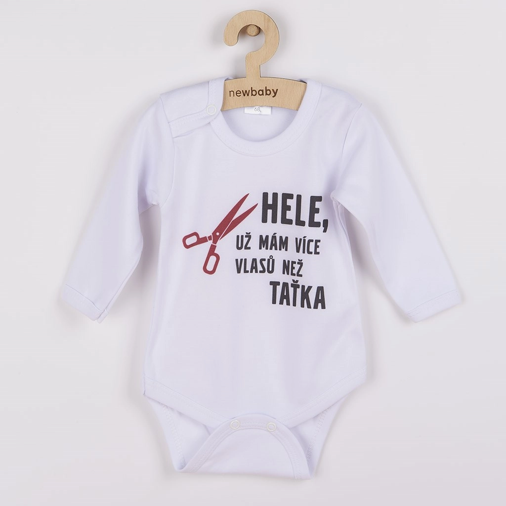 Originele katoenen babyromper met lange mouwen en een grappige tekst KIJK, IK HEB AL MEER HAAR DAN PAPA. Comfortabele pasvorm, gecertificeerde verven voor baby’s en praktische drukknoopsluiting op de schouder en tussen de beentjes maken aankleden en verschonen gemakkelijk. 100% katoen zorgt elke dag voor zachtheid en comfort. Product van een Tsjechisch merk in een mooie geschenkverpakking.