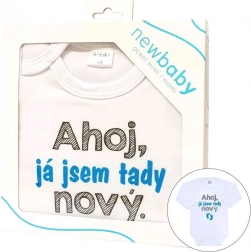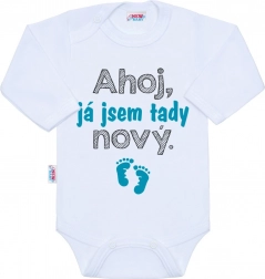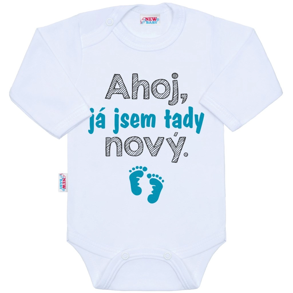 Schattige babyromper NEW BABY met lange mouwen en een grappige tekst “Hoi, ik ben hier nieuw”. Gemaakt van 100% katoen voor de tere babyhuid, met gecertificeerde printkleuren. Praktische drukknoopsluiting op de schouder en tussen de beentjes maakt aan- en uitkleden en verschonen gemakkelijker. Ideaal als origineel cadeau voor pasgeborenen.