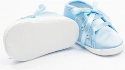 Stijlvolle satijnen babyslofjes van het merk New Baby met een modern design en comfortabele vetersluiting. Ze zijn licht, hebben een brede binnenkant voor vrije teenbeweging en een dunne synthetische buitenzool. Ideaal voor thuis of in de kinderwagen, niet bedoeld om mee te lopen.