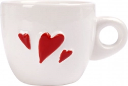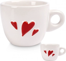 Geniet van je favoriete espresso in een kop die zowel ogen als handen verwent. Witte keramiek met verhoogde rode hartjes geeft je tafel een romantische toets, terwijl het compacte volume van 80 ml de rijke crema en het aroma van de koffie benadrukt.