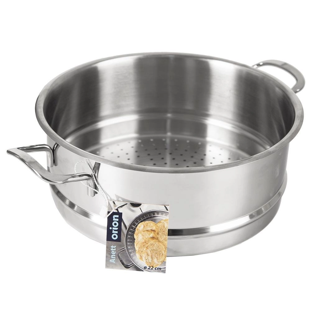 Dankzij de geperforeerde bodem circuleert de stoom gelijkmatig, terwijl de gevormde ring langs de rand voor stabiele plaatsing op de pan zorgt en stoomverlies minimaliseert. Met klinknagels bevestigde handgrepen maken veilige handling eenvoudig. De inzet is compatibel met pannen van 24 cm en kan moeiteloos in de vaatwasser worden gereinigd.