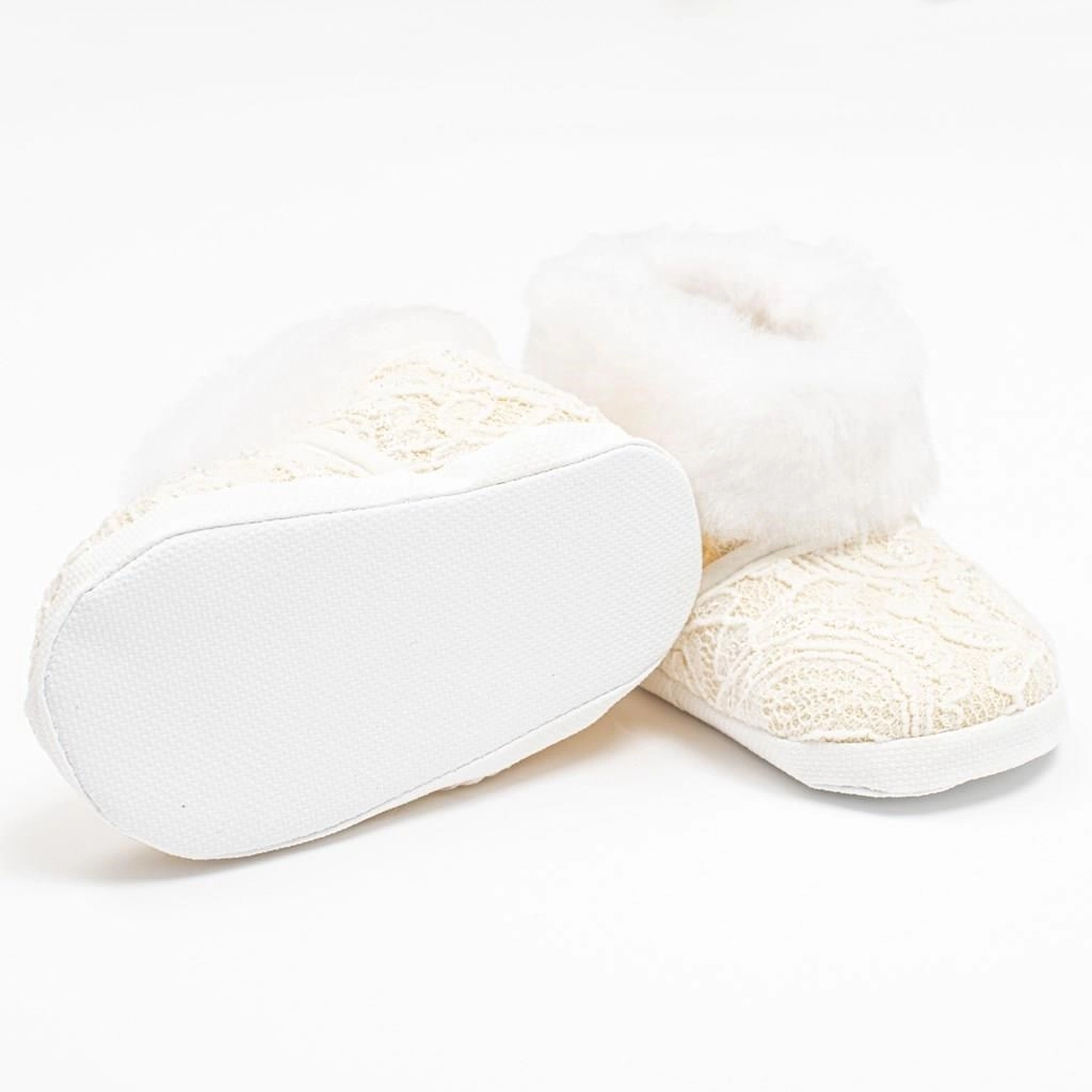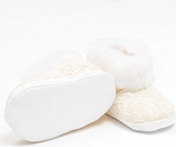 Stijlvolle winterse slofjes met een kanten structuur in een neutrale beige kleur combineren een elegante look met maximaal comfort. De binnenkant is gevoerd met zachte fleecetricot (100% polyester), die behaaglijk warm is en zacht voor de gevoelige babyhuid. De slofjes zijn niet bedoeld om mee te lopen – ze dienen als warme en comfortabele bescherming voor in de kinderwagen of om thuis te dragen.