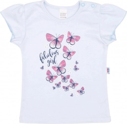 Ontdek de zachte en comfortabele meisjesset New Baby Butterflies – ideaal voor dagelijks gebruik en speciale gelegenheden. Het T-shirt van soepele 100% katoen met geplooide mouwtjes is versierd met schattige vlinders en dankzij de drukknoopjes op de schouder is aankleden heel eenvoudig. De donkerblauwe rok met brede elastiek in de taille drukt niet op het buikje en de volant geeft de outfit een speelse look.