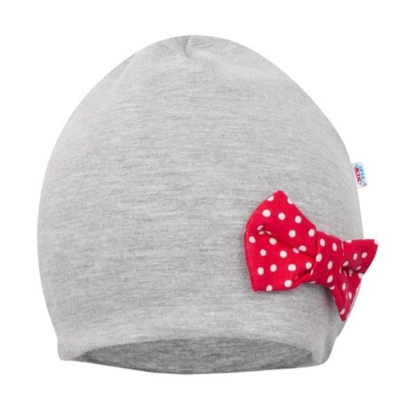 Schattige 2-delige set NEW BABY Missy in grijs‑rood, bestaande uit een mutsje met strik en een omkeerbare halsdoek. Dankzij de dubbele laag stof zijn de oren beter beschermd tegen de wind, de halsdoek heeft een verstelbare sluiting in 2 maten en is ideaal voor lente en herfst. Het aangename materiaal van 95% katoen en 5% elastaan zorgt voor comfort en elasticiteit.