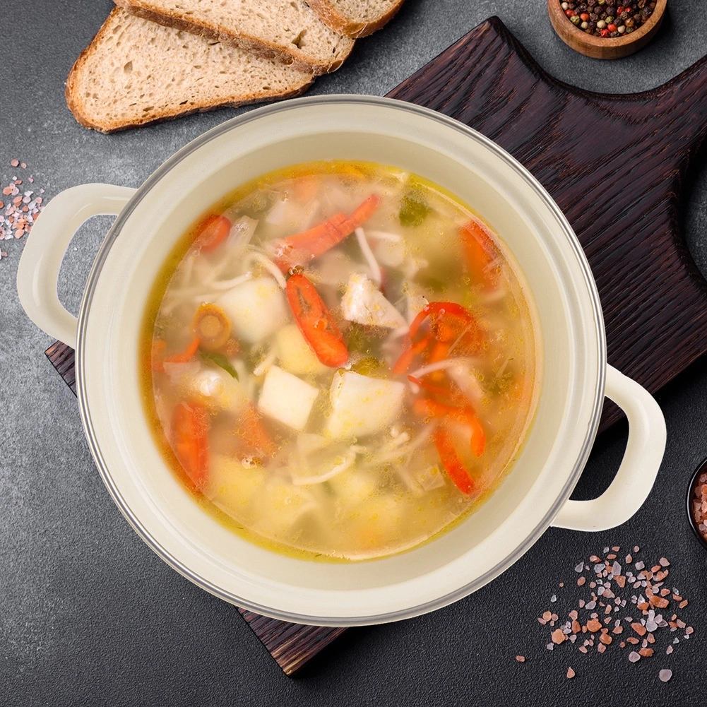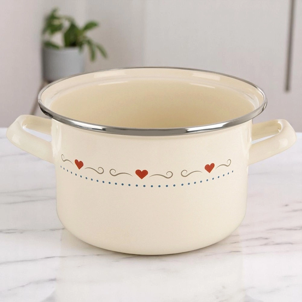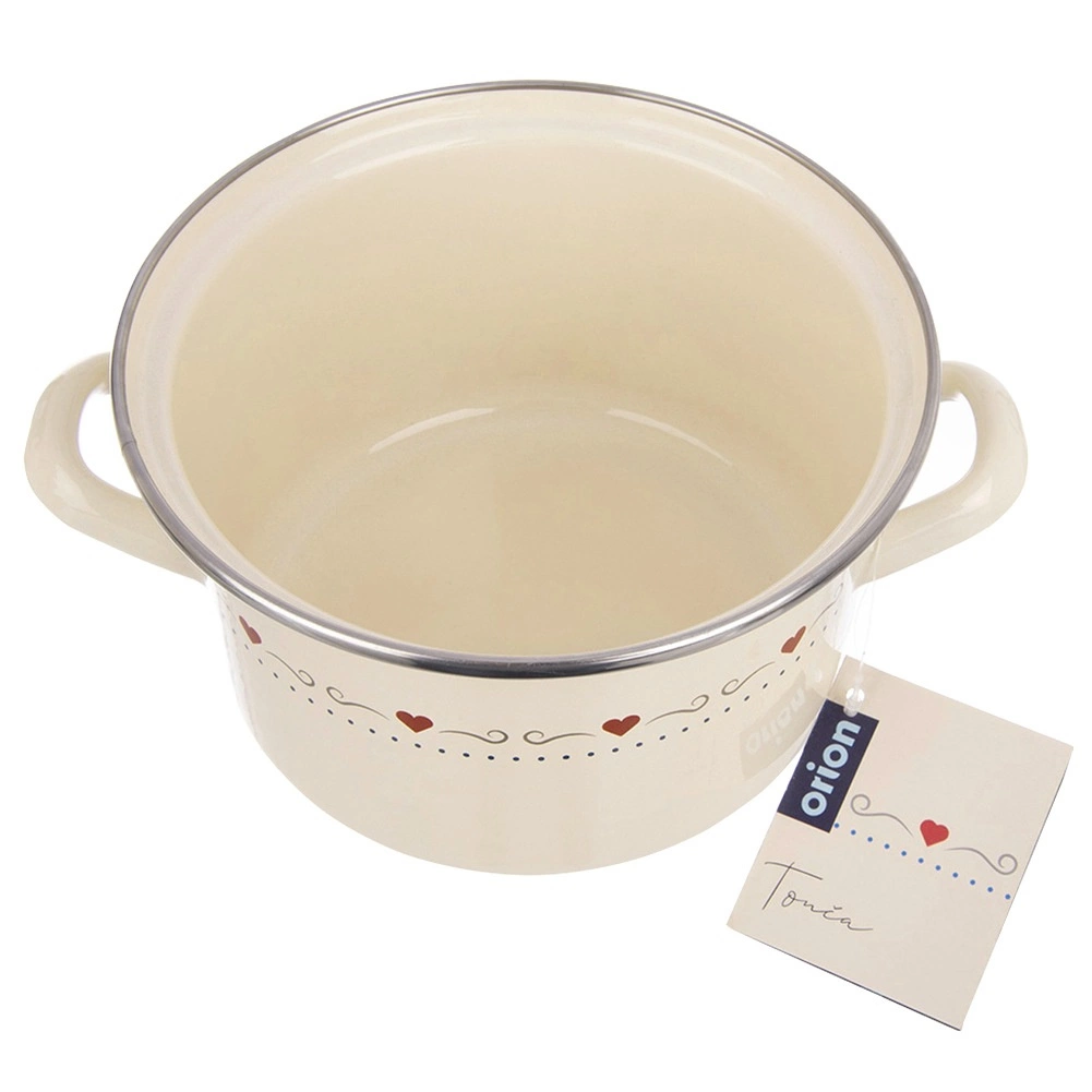 Ontdek een praktische helper voor dagelijks koken. De geëmailleerde pan TONCA in retrostijl is ideaal voor het koken en stoven van soepen, sauzen en hoofdgerechten. Het mooie crèmekleurige design met hartjes siert je keuken en de stevige handgrepen zorgen voor veilige hantering.