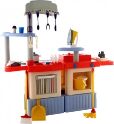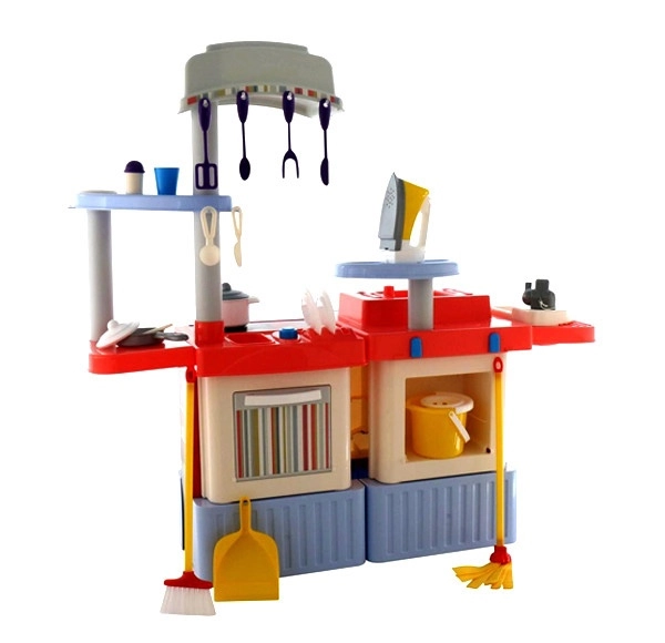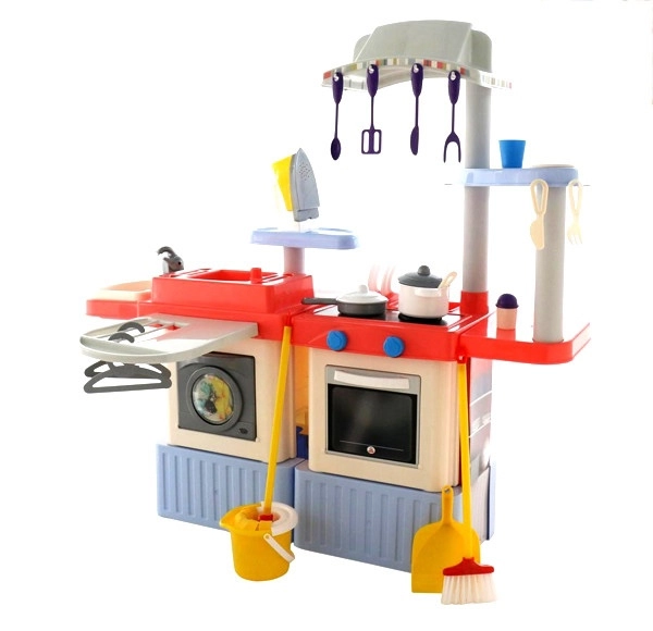 - Twee speelzones: keukengedeelte + gedeelte met wasmachine, wastafel en strijkplank