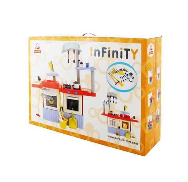De Infinity Premium kinderkeuken biedt kinderen een complete thuisbasis voor spel rond koken, wassen en strijken. De set bestaat uit twee delen: een keukenmodule en een module met wasmachine, wastafel en strijkplank – beide delen kunnen samen of afzonderlijk worden gebruikt. Dankzij het uitgebreide accessoirepakket is het spel direct klaar voor realistische rollenspellen.