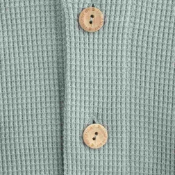 De subtiele grijze tint, het mooie kraagje en de houten knopen geven het jasje een tijdloze uitstraling die gemakkelijk te combineren is met andere items in de uitzet. Het jasje kan los als vest gedragen worden of als lichte laag over een T‑shirt of jurkje.