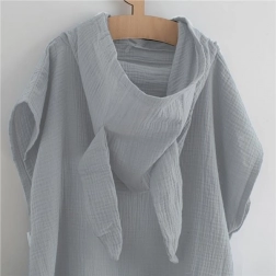 Licht en zacht kinder mousseline poncho NEW BABY Feeling in lichtgrijs is ideaal na het bad, bij het zwembad en op het strand. Dankzij 100% katoen is het luchtig, sneldrogend en absorberend en prettig voor de gevoelige kinderhuid. Praktische capuchon met schattige oortjes, drukknopen aan de zijkant voor makkelijk aankleden en een losse snit die meegroeit met het kind.