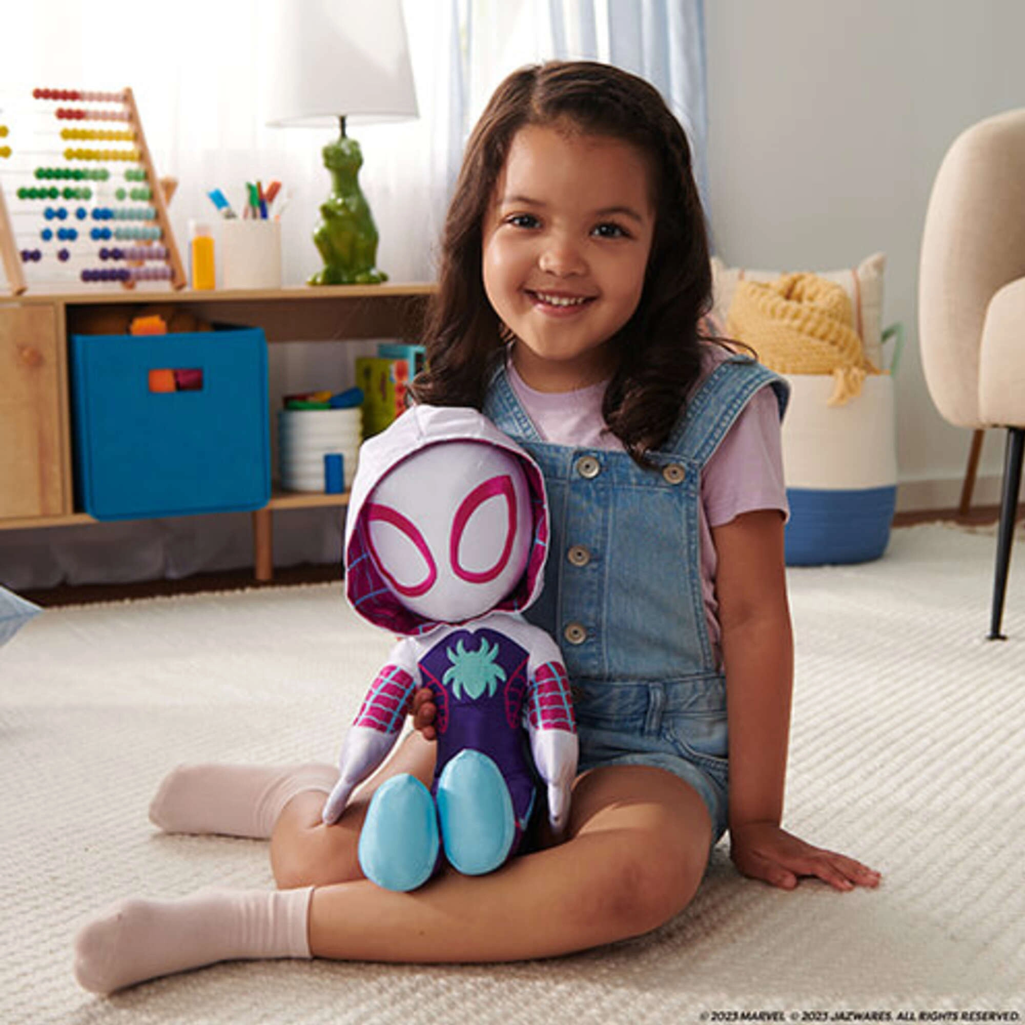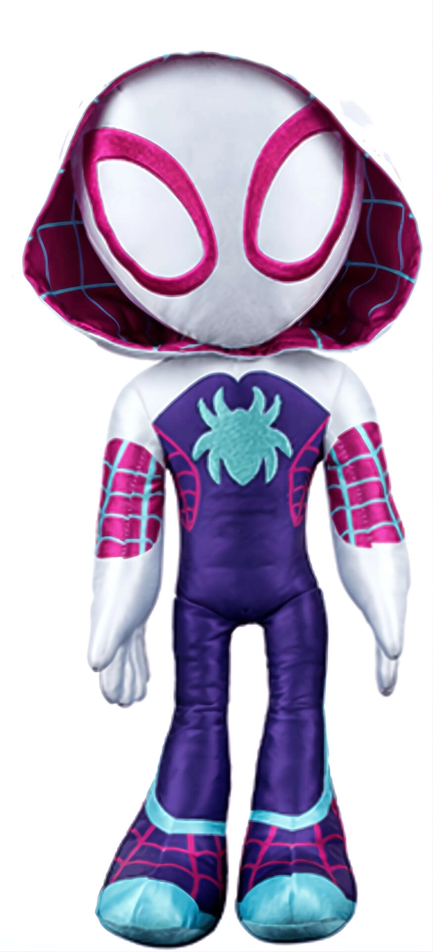 De geliefde heldin Ghost-Spider (Gwen Stacy) komt als zachte pluche knuffel uit de serie Spidey en zijn geweldige vrienden. Dankzij de hoogwaardige afwerking met geborduurde gelaatsdetails en het kenmerkende witte pak met roze-blauwe accenten is ze direct herkenbaar en klaar voor dagelijks spelen en knuffelen.