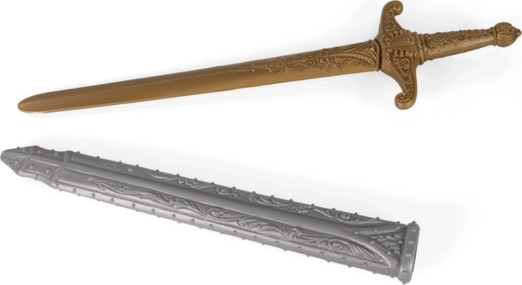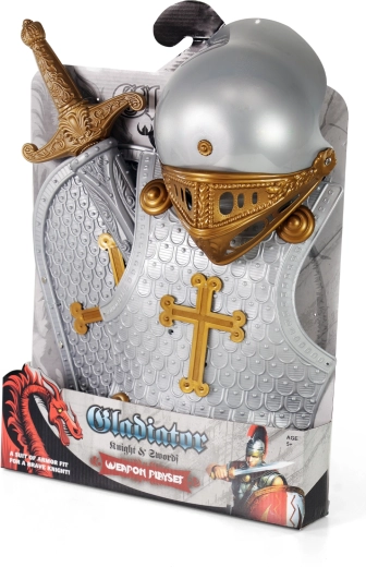 De set bevat alles wat kleine ridders nodig hebben om hun heroïsche dromen te vervullen – een zwaard met schede, schild, helm en vest.