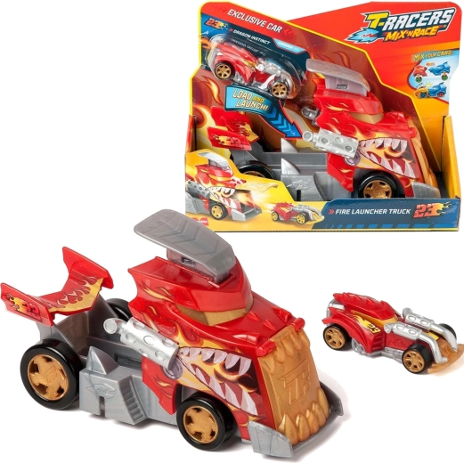 De set T-Racers Mix ’N Race Fire Launcher Truck biedt kinderen dynamische races en de vrijheid om zelf te bouwen. De draak-stijl vrachtwagen vervoert je autootjes en stuurt ze dankzij de geïntegreerde lanceerramp met bliksemsnelheid vooruit. Inclusief een exclusieve racewagen waarvan de onderdelen te combineren zijn met andere modellen uit de Mix ’N Race-lijn.