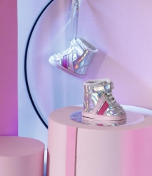 Veterschoenen met holografisch effect en roze elementen zijn een hit in de poppenmode.