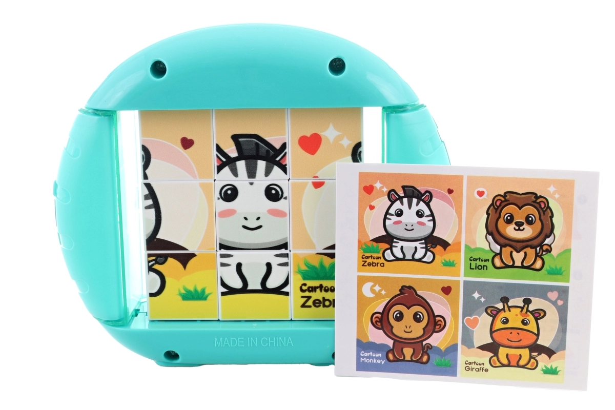 Een leuke en leerzame puzzel voor kinderen vanaf 3 jaar die het logisch denken, de fijne motoriek en de geduldigheid ontwikkelt. Door blokjes te draaien en te schuiven stellen kinderen stap voor stap afbeeldingen van vier favoriete dieren samen. Het compacte ontwerp van kunststof en de verpakking in een transparant doosje maken het een ideale speelgoed voor onderweg.