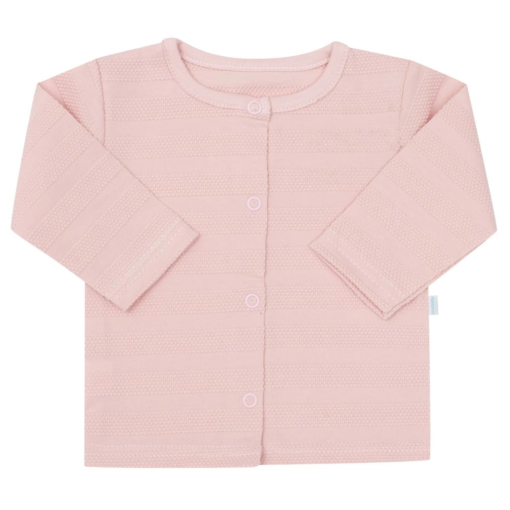 In de set vind je: volledig openslaand rompertje met lange mouwen (zijsluiting en drukknopen tussen de beentjes), kruippakjes (drukknopen op de schouders en in het kruis), jasje met drukknopen over de volledige lengte en een superzacht mutsje met brede zoom. Een modern, subtiel design en bijpassende roze kleur waar elke ouder blij van wordt.