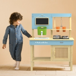 Het praktische reservoir met kraan brengt echt water in het spel: kinderen kunnen schenken, afwassen, orde houden en oog-handcoördinatie oefenen. De keuken is ideaal voor rollenspel als restaurant of winkeltje en ontwikkelt sociale vaardigheden tijdens samen koken met vriendjes.