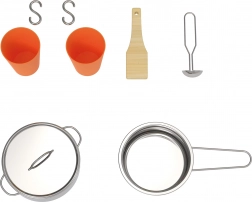 Pannen met deksels, 2 bekers, spatel, lepel, krijtbordje