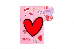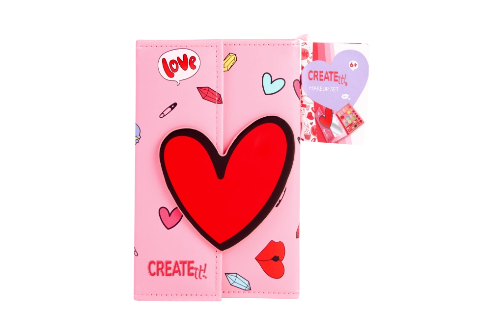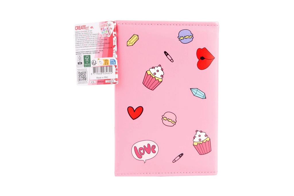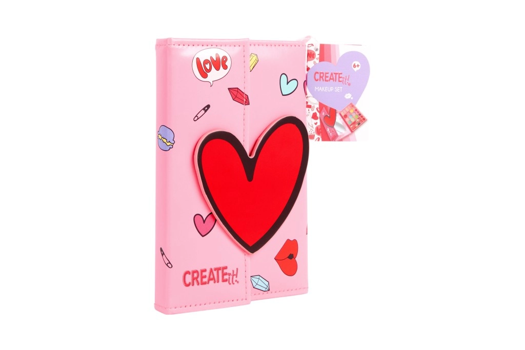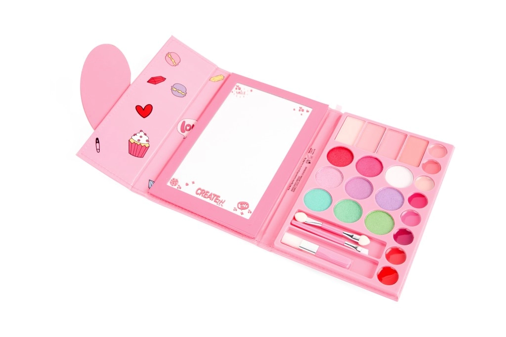 Ontdek de creatieve wereld van make-up met de CREATE IT! kinderset in de vorm van een magnetisch boek. Dankzij de slimme opvouwbare etui met hartje is alles overzichtelijk geordend, makkelijk mee te nemen en direct klaar voor gebruik. Kleurvolle paletten en accessoires stimuleren veilig experimenteren, prikkelen de fantasie en bevorderen de fijne motoriek.