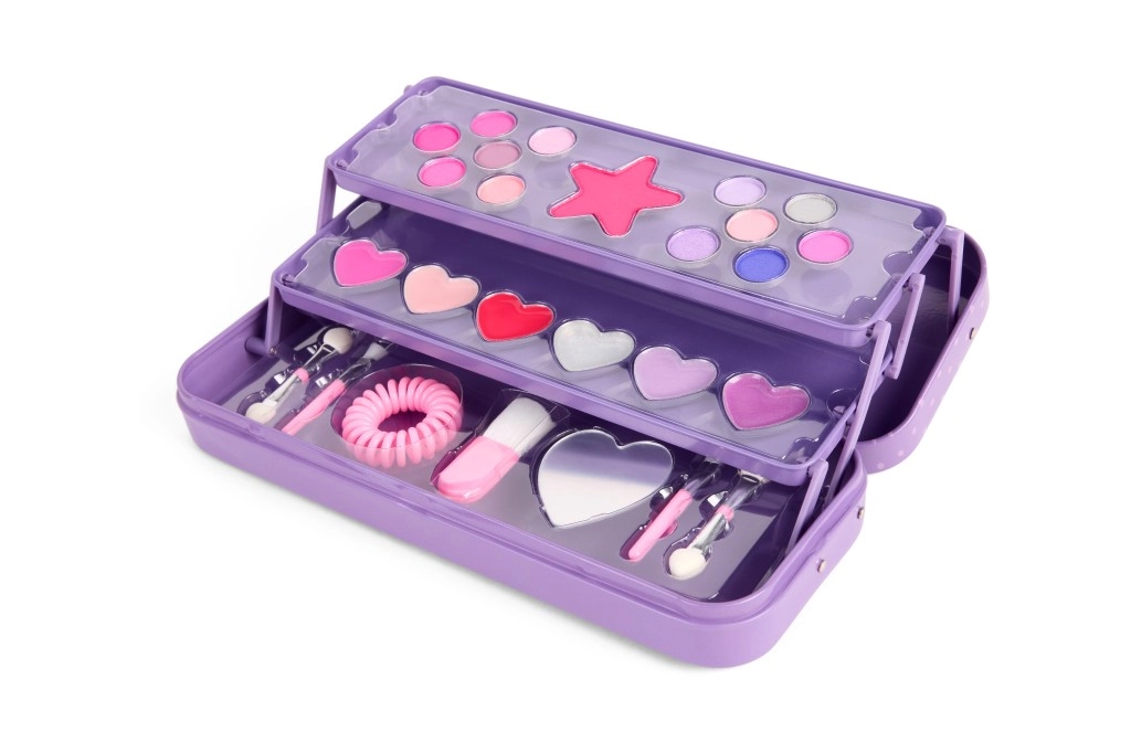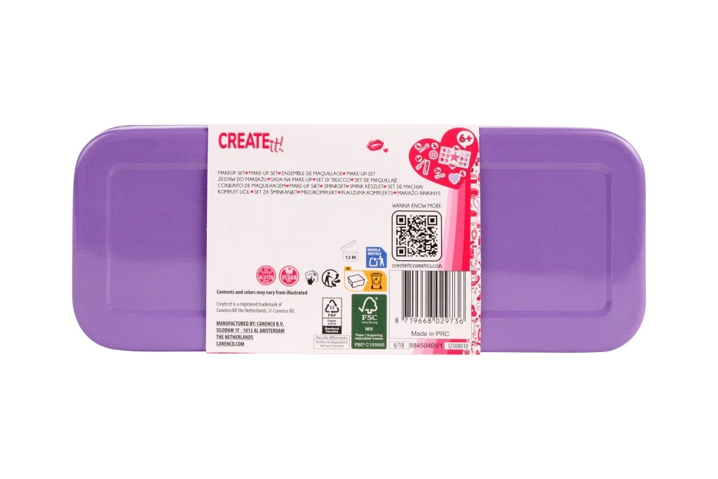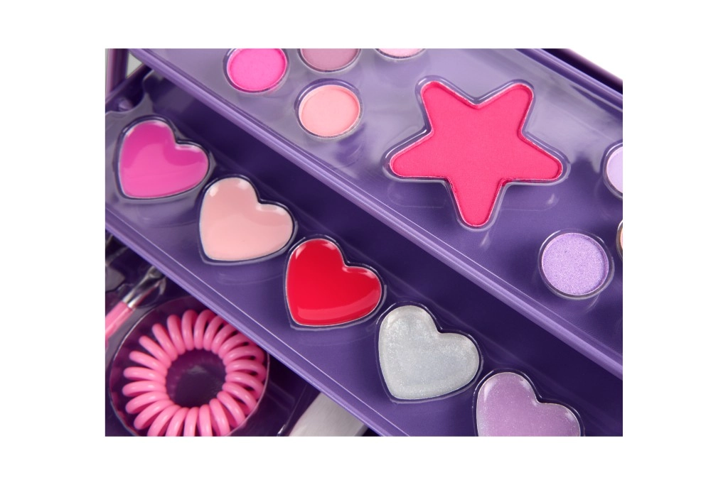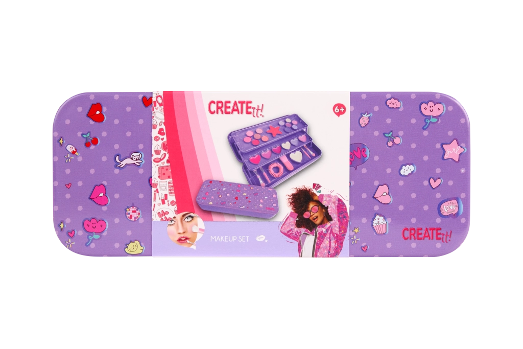 Stijlvolle paarse make-upcassette CREATE IT! in een praktische metalen doos biedt alles wat kleine beautyfans nodig hebben. De drie lagen verbergen 10 oogschaduws, een blush, 6 lipglosses, kwastjes, een haarelastiek en een spiegel in hartvorm. Dankzij de uitklapbare constructie is de inhoud overzichtelijk gerangschikt en gemakkelijk toegankelijk – ideaal voor op reis en voor thuis make-up aanbrengen.