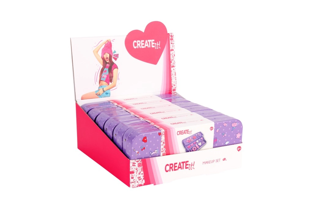Ontdek de compacte en speelse CREATE IT!-cassette die vrolijke kleuren, een schattig design en een praktische indeling combineert. De drielagige uitklapbare metalen doos in paarse look houdt de cosmetica veilig op zijn plek en zorgt voor snelle oriëntatie tussen schaduws, glosses en accessoires.
