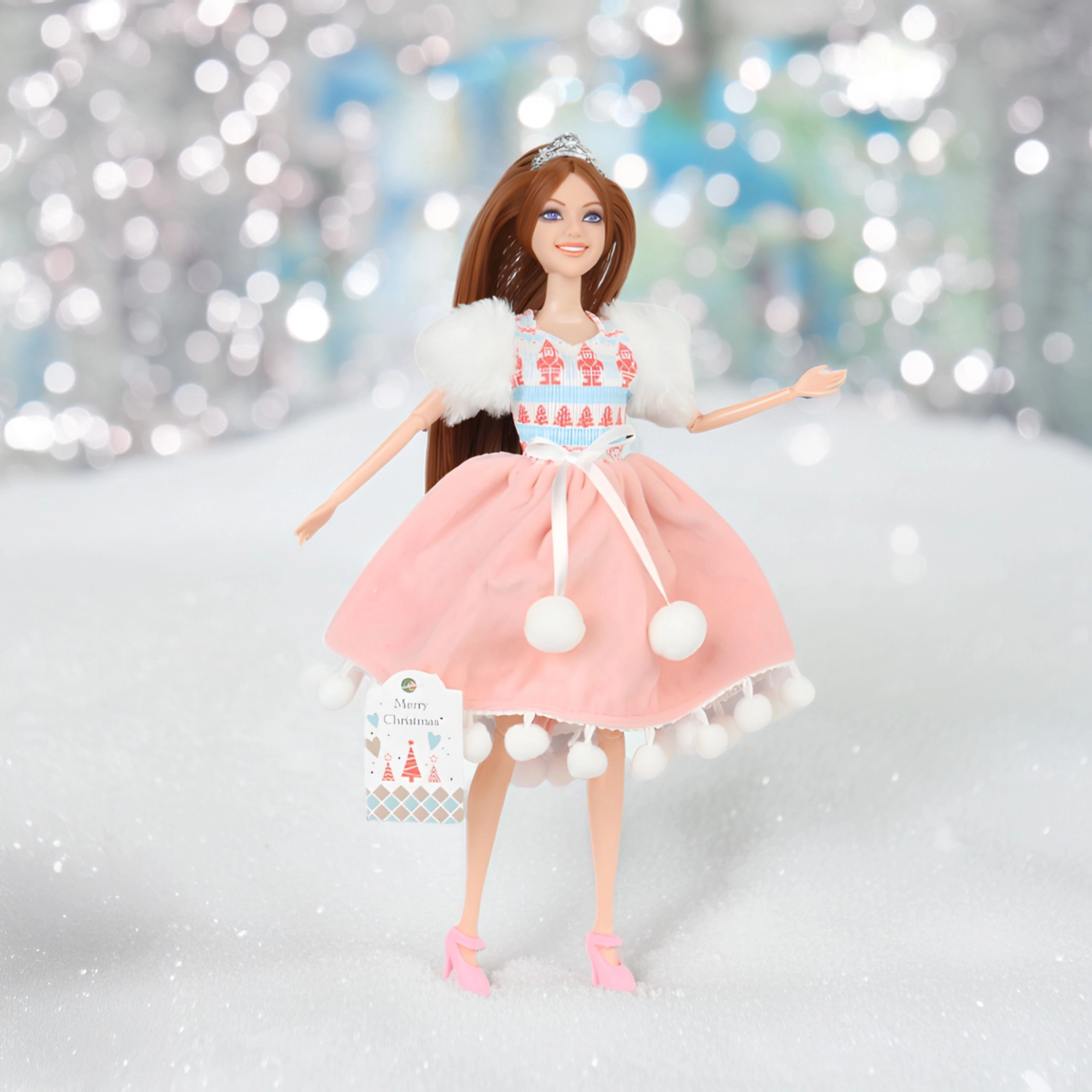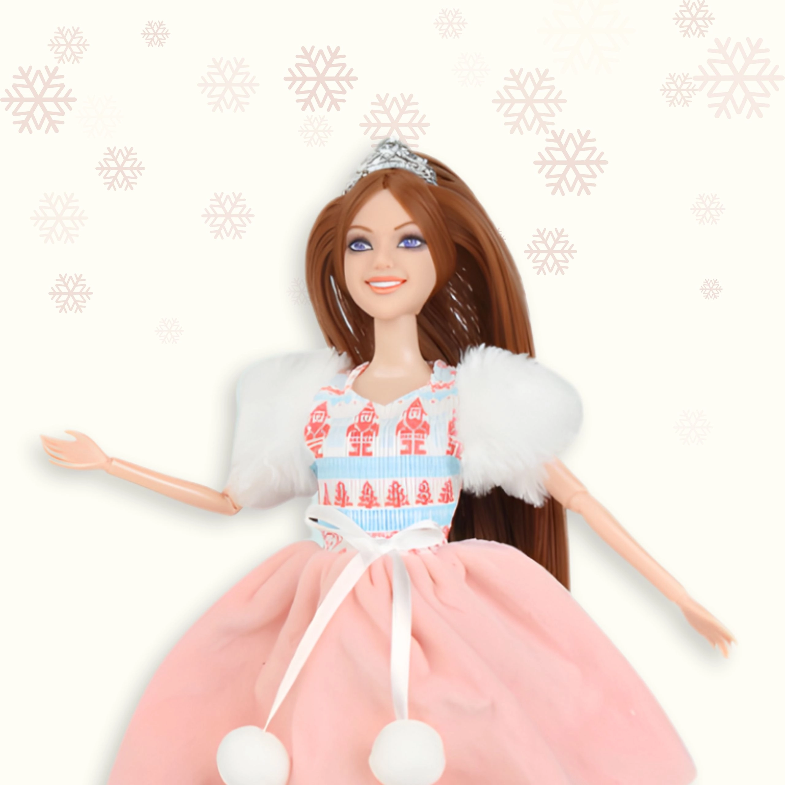 - Stijlvolle winterpop met lang bruin haar en een kroon