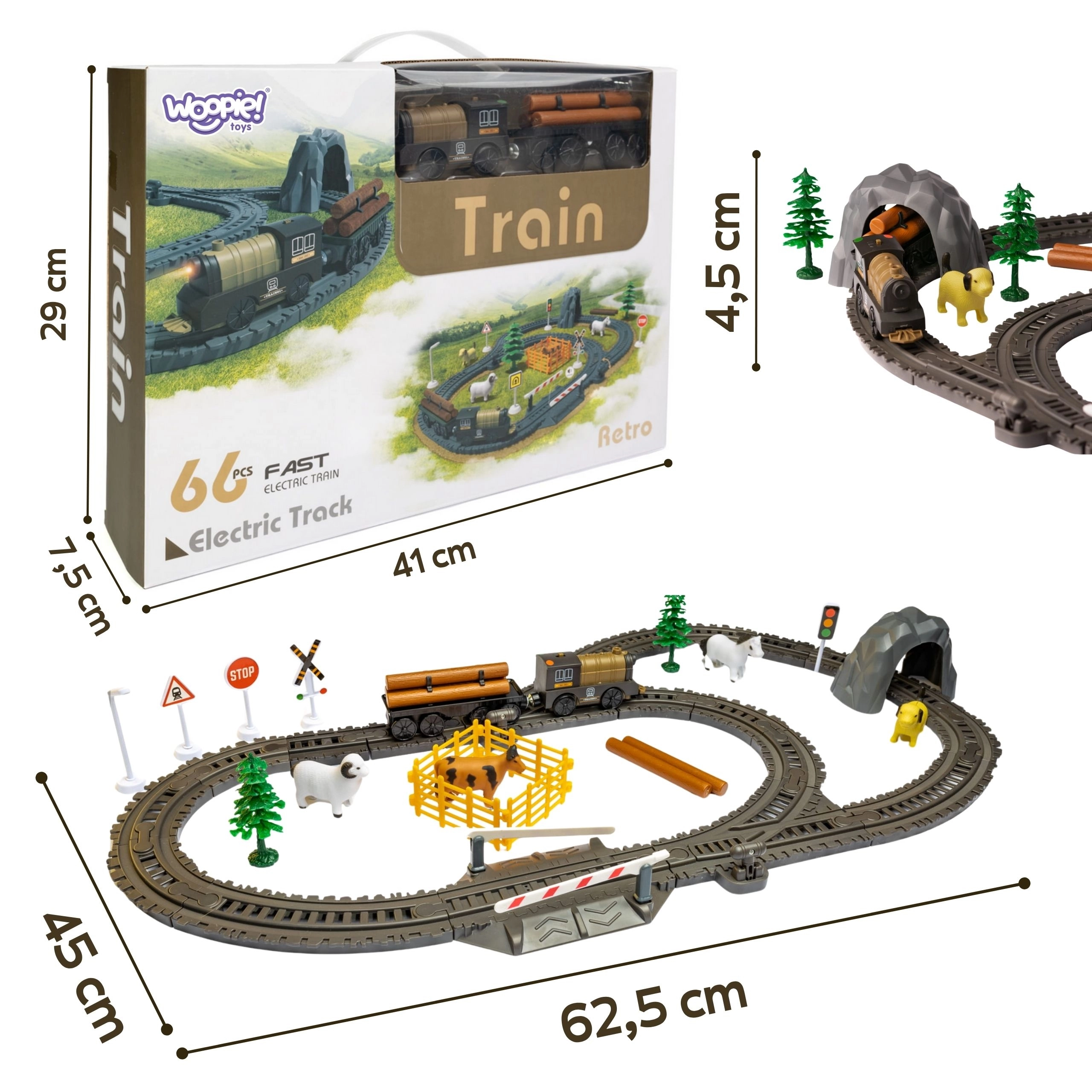 Deze retro elektrische treinspeelbaan van WOOPIE biedt uren plezier voor zowel kinderen als volwassenen. De batterijlokomotief rijdt vooruit en achteruit, heeft een frontlicht en rijdt soepel over de gekleurde rails dankzij doordachte wissels. Met de rijke uitrusting kun je diverse routes en scenario’s bouwen – van eenvoudige circuits tot vertakte trajecten.