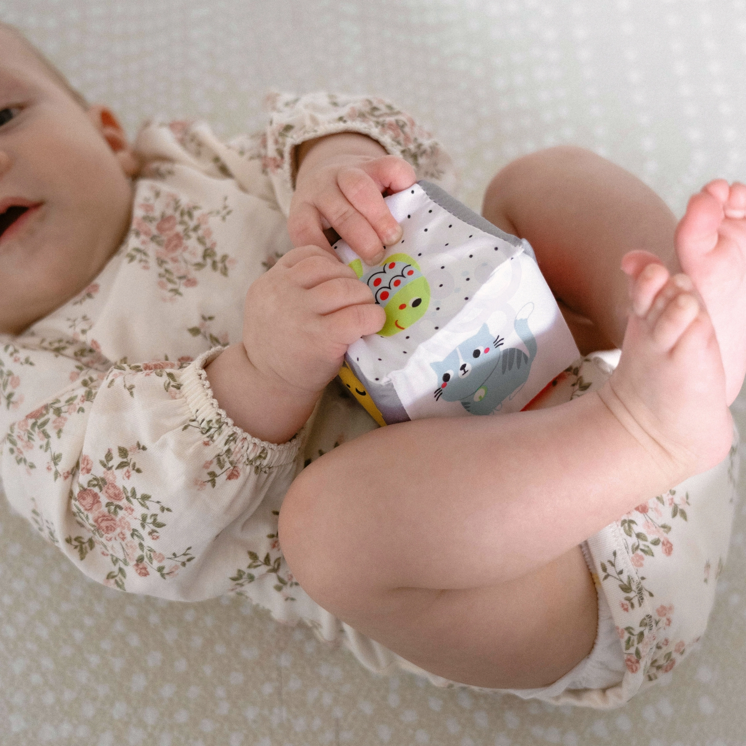 Deze zorgvuldig samengestelde Montessori-box bevat 6 didactische hulpmiddelen die het natuurlijke leerritme van de baby ondersteunen. Contrasterende patronen en de spiegel stimuleren het zicht, zachte textielen en hout ontwikkelen de tastzin en zacht gerammel of “regen” in de buis prikkelt het gehoor. Alles is ontworpen om het kind te motiveren tot grijpen, verplaatsen, rollen en de eerste ontdekkingen van oorzaak en gevolg.