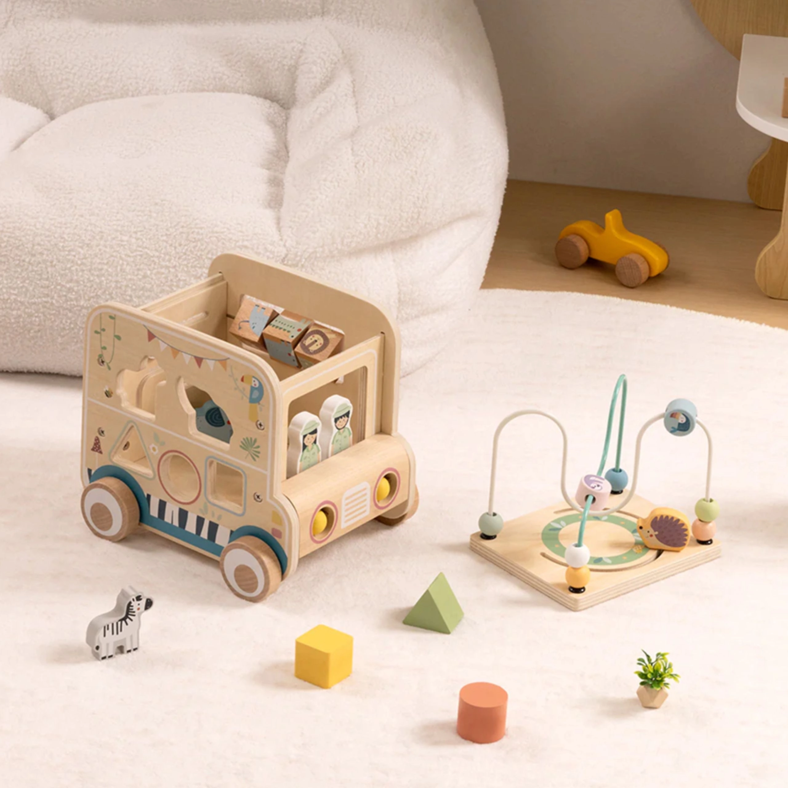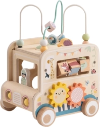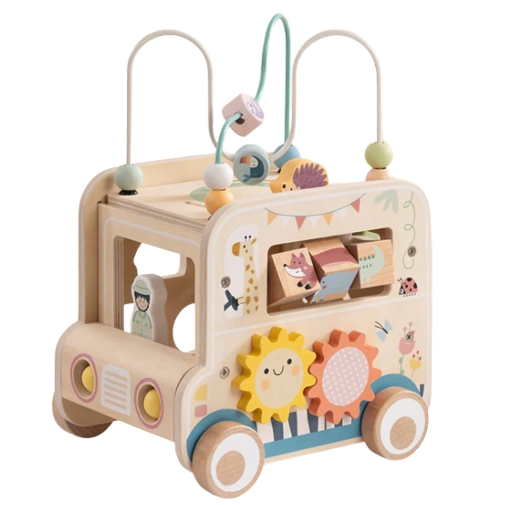 De houten actieve kubus/safari-auto biedt kinderen eindeloze ontdekkingsmogelijkheden. Van de afneembare motoriekbaan met kralen, via het labyrint en de tandwielen, tot de draaiende blokjes met dieren – elke zijde biedt een nieuwe uitdaging. Het ontwerp in zachte kleuren en de gladde afwerking zorgen voor veilig spel en vaardigheidsontwikkeling.