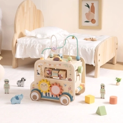Ontdek een speelse wereld met de houten actieve kubus in de vorm van een safari-auto van het merk WOOPIE GREEN. Dit multifunctionele speelgoed combineert een motorische kralenbaan, vormensorteren, draaiende tandwielen en afbeeldingsblokjes om de fijne motoriek, coördinatie en creatieve spel van kinderen vanaf 18 maanden te stimuleren.