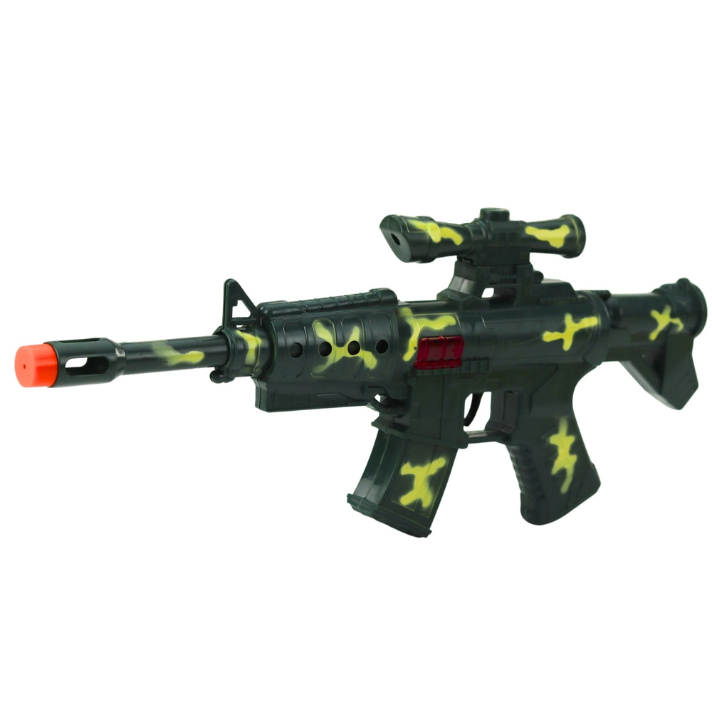 Bij het overhalen van de trekker klinkt een duidelijk mechanisch schoteffect dat de spelbeleving versterkt. De kunststof constructie met camouflagedetails is licht en veilig voor kinderen.