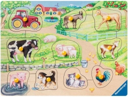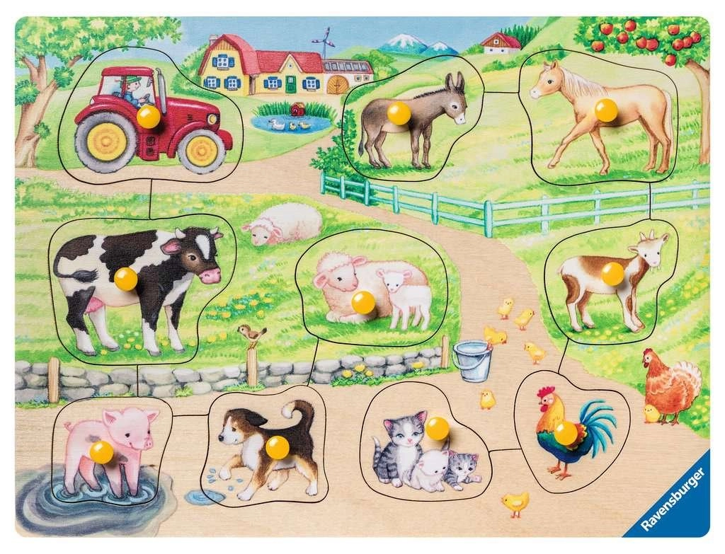 De houten inlegpuzzel van Ravensburger uit de serie Mijn eerste houten puzzels brengt leren door spel dichterbij. Tien stevige stukjes met liefdevol geïllustreerde boerderijmotieven helpen belangrijke vaardigheden te ontwikkelen en ondersteunen de juiste greep dankzij de kunststof knopjes op elk stukje.