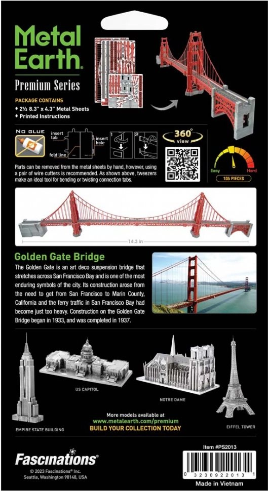 Ontdek het plezier van precisie-modelbouw met de metalen 3D-puzzel METAL EARTH Premium. Dankzij lasergravure komen zelfs de kleinste details van de legendarische Golden Gate-brug tot leven – van de torens en hangkabels tot het realistische wegdek. Het voltooide model is een geweldige interieuraccent, een cadeau voor architectuurliefhebbers en een ideale keuze voor verzamelaars van metalen miniaturen.