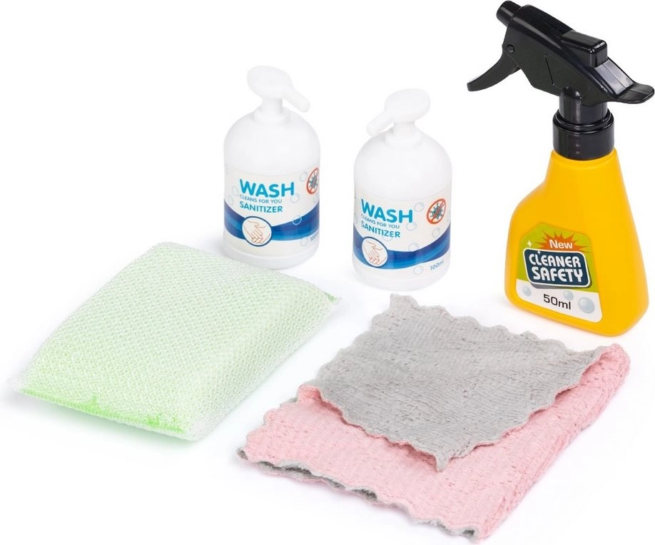 De set bevat een uitgebreid assortiment accessoires: stofzuiger, mop, bezem, handveger en stoffer, sprayfles, spons en doekjes, eventueel ook een waarschuwingsbord en een mand. Alles is afgestemd op kinderhanden voor een veilige grip en eenvoudig opbergen op de kar. Kwalitatieve materialen garanderen een lange levensduur, ook bij frequent gebruik.