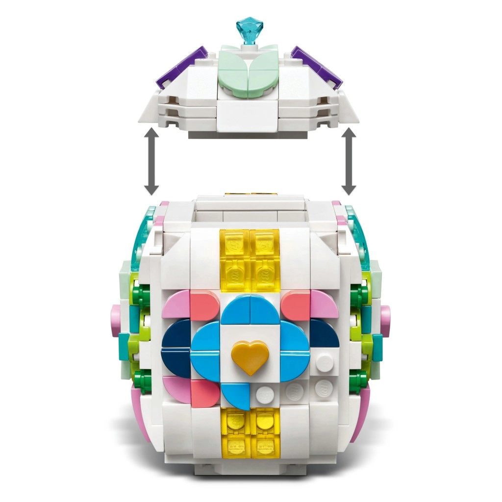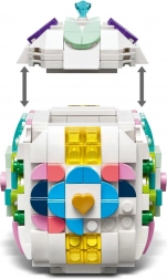 Dit elegante witte ei van LEGO-steentjes is ongeveer 10 cm hoog en 7,9 cm breed – een ideaal formaat voor op een plank, tafel of in een paasarrangement. Dankzij de rijke set pastelkleurige en transparante onderdelen (hartjes, blaadjes, “diamanten”) maak je eenvoudig een origineel patroon dat je op elk moment kunt aanpassen.