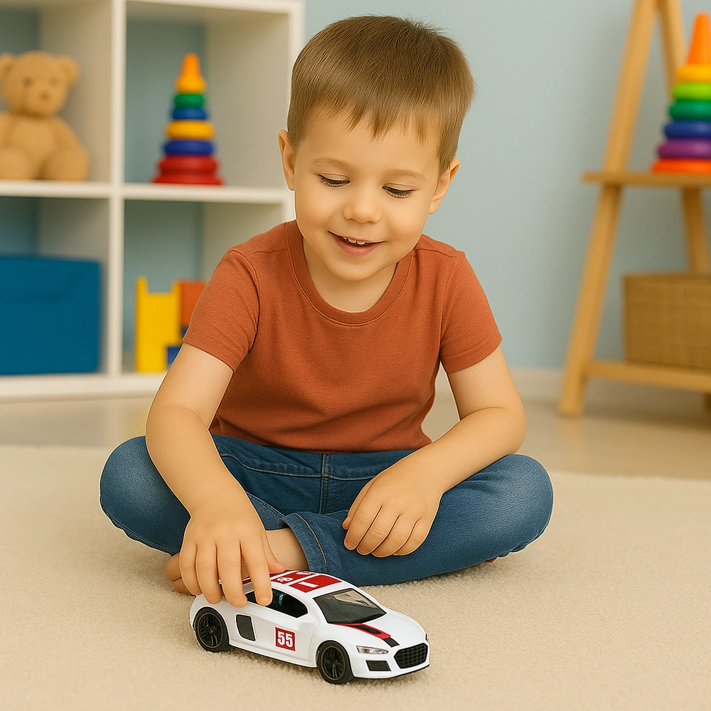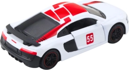 Compacte metalen sportwagen in schaal 1:43 die zowel kinderen als verzamelaars zal bekoren. Voorzien van pull-back aandrijving, te openen deuren en realistische details in een witte carrosserie met rode accenten. De duurzame die-cast constructie zorgt voor een lange levensduur en een geweldige uitstraling.