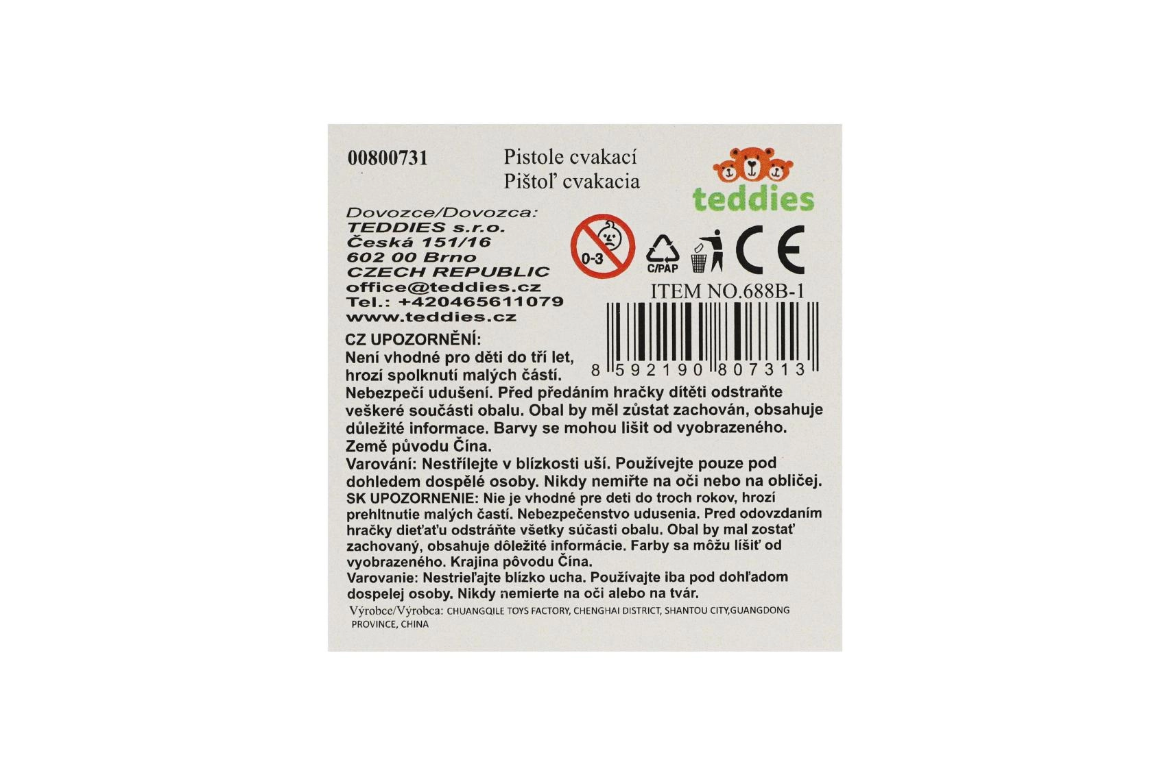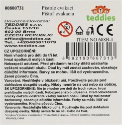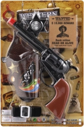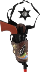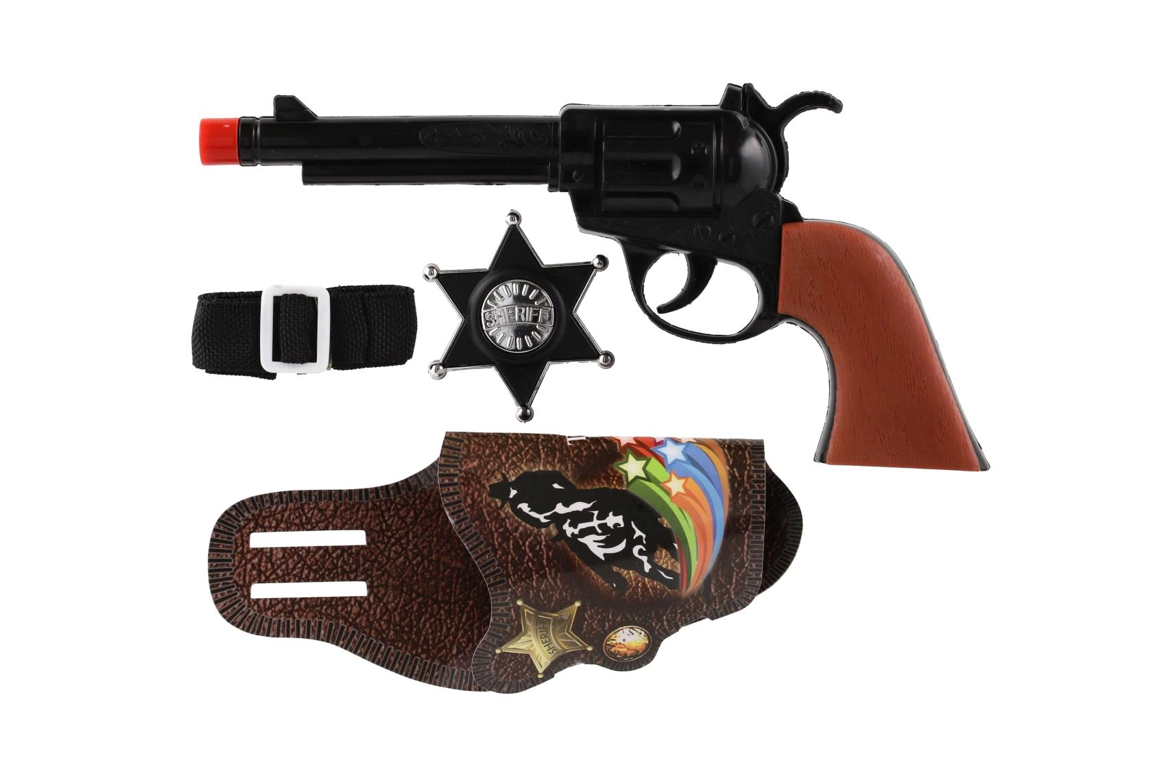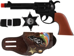 Een klapperend kinderspeelgoedpistool met accessoires, ideaal voor cowboy- en sheriffspelletjes. Gemaakt van lichtgewicht plastic, geeft het bij het overhalen van de trekker een typisch klapperend geluid zonder munitie, en dankzij de lengte van ca. 22 cm ligt het goed in een kinderhand. De verpakking bevat thema-accessoires die de fantasie stimuleren en de speelmogelijkheden uitbreiden.